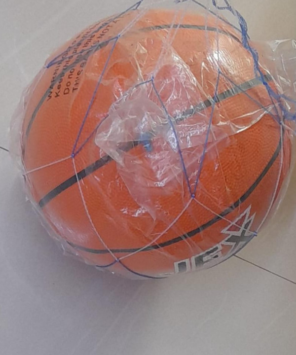 A basketball is centrally positioned in the image. The basketball is wrapped in a clear plastic bag. A net is attached to the basketball, indicating it's new and unused. There is some text visible on the packaging, but it's partially obscured and difficult to read fully. The legible parts include: "WARNING," "Do not this res," "THISS," and "LON SA."
