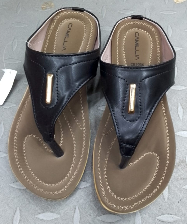 The image shows a pair of sandals sitting on top of a table. The sandals have a tan sole and straps that criss-cross over the top of the foot. The straps are made of a smooth leather material. The word "Camillia" is written on the straps of the sandals.