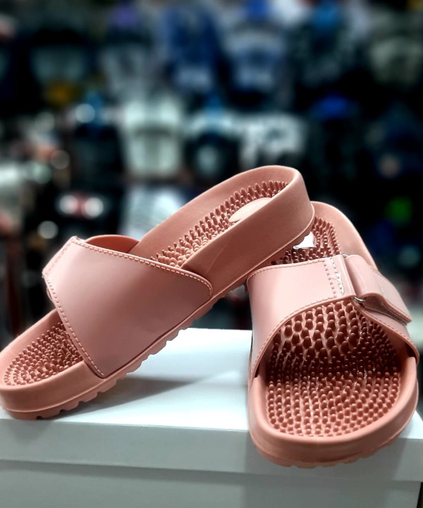 A pair of pink platform sandals sitting on top of a white box. The sandals have a thick sole made of cork or a similar material, and a pink upper section with two wide straps. The straps are decorated with silver studs. The white box is plain and featureless.