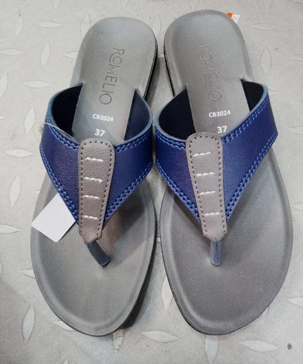 The image shows a pair of blue and gray flip flops resting on a surface. The flops have a thick blue sole with a textured tread. The straps are gray and made of a smooth material.