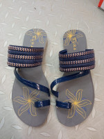 A pair of sandals with a floral design on them. They are placed on a table, and the straps and soles are visible. The floral design appears to be delicate and colorful.
