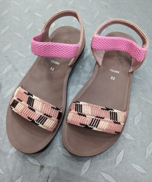 The image shows a pair of pink and brown sandals with a pink strap. The sandals are sitting on top of each other on a table. The sandals have a thick, textured brown sole. The straps are made of a pink material and criss-cross over the top of the foot. The straps attach to the sole with a silver buckle.