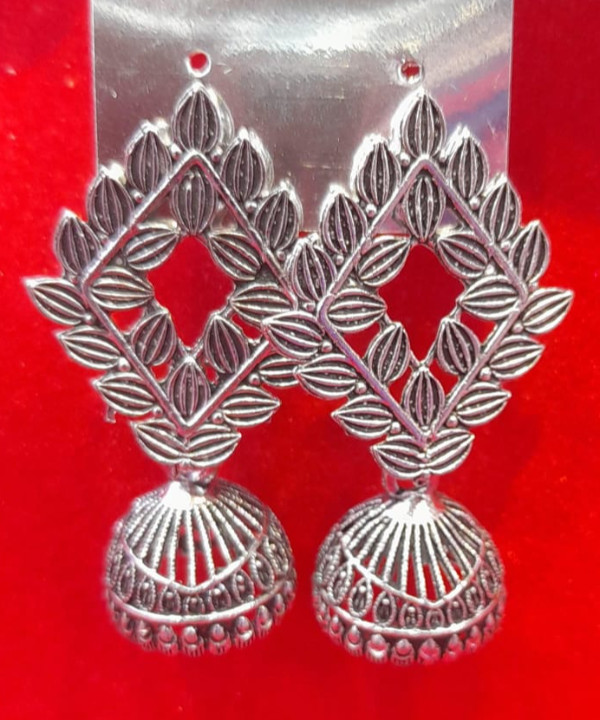 A pair of silver earrings is prominently displayed in the center of the image. The earrings have a delicate leaf design, with each earring featuring a single, gracefully curved leaf. They are resting on a smooth, solid red surface that provides a striking contrast to the silver. The lighting in the image highlights the earrings' metallic sheen and the intricate details of the leaf design.