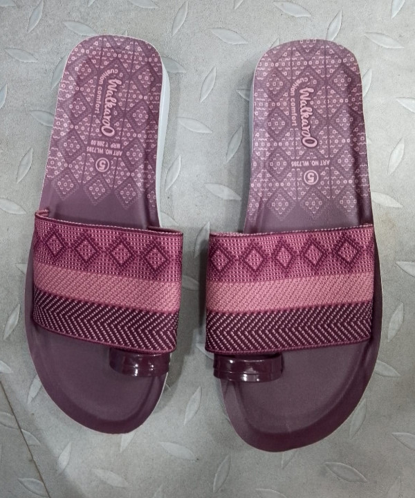 The sandals are a pair of women's slippers. They are purple with a white floral pattern on the upper part of the slipper. The slippers also have a white sole with a textured tread.